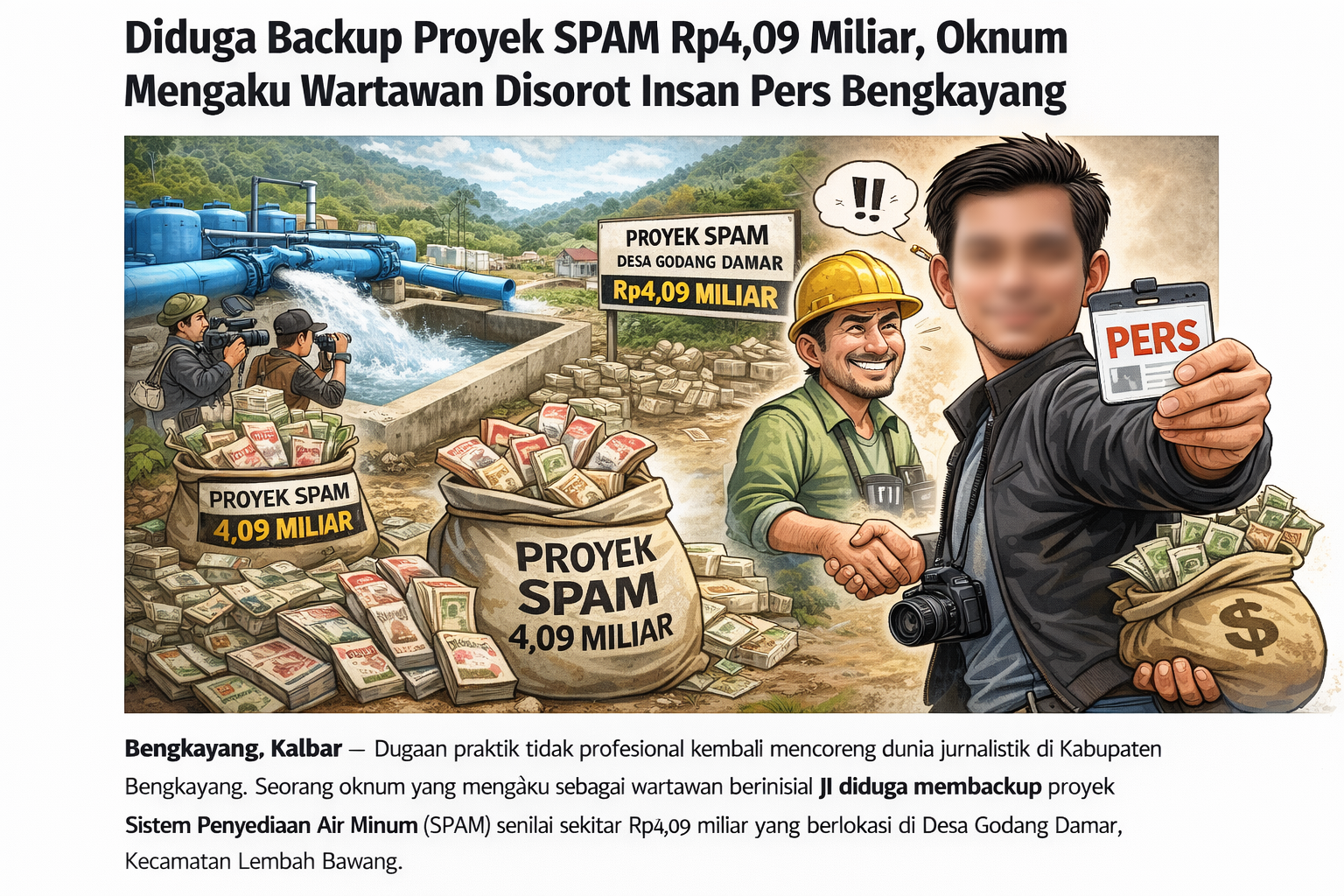 Bengkayang,gabungnyawartawanindonesia.co.id-Kalbar— Dugaan praktik tidak profesional kembali mencoreng dunia jurnalistik. Seorang oknum yang mengaku wartawan berinisial JI diduga membackup proyek Sistem Penyediaan Air Minum (SPAM) dengan nilai anggaran sekitar Rp4,09 miliar yang berlokasi di Desa Godang Damar, Kecamatan Lembah Bawang, Kabupaten Bengkayang.