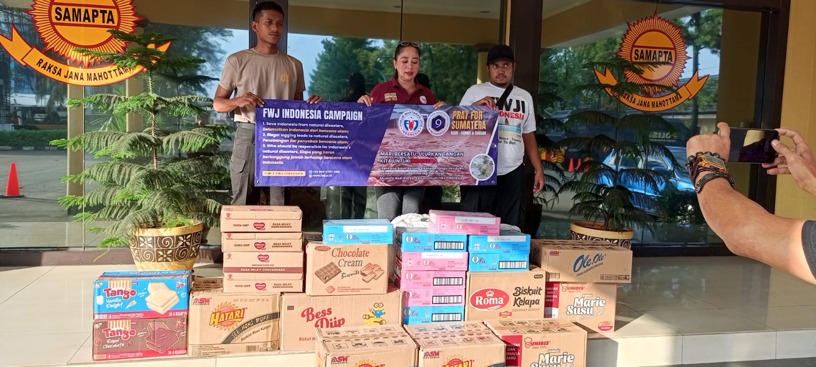 Melalui pengurus DPP FWJI terhimpun donasi/bantuan berupa makanan ringan/snack dan juga susu UHT serta pakaian layak pakai, yang diserahkan melalui Kantor Koshabara Baharkam Polri, di Pasir Gunung Selatan, Kelapa Dua, Cimanggis, Depok, pada hari Sabtu, (13/12/2025).