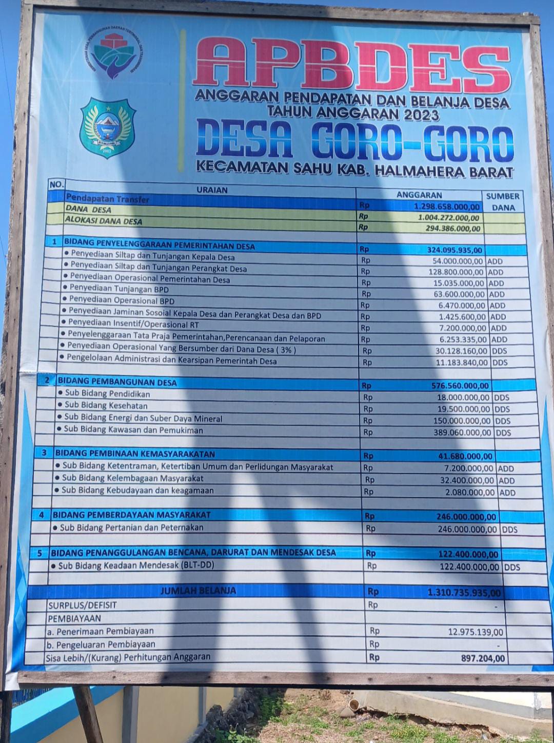 Halmahera Barat, gabungyawartawanindonesia.co.id – Desa Goro-Goro Kecamatan Sahu Kabupaten Halmahera Barat Provinsi Maluku Utara dari tahun ke tahun menerima dana desa dengan rincian sebagai berikut: