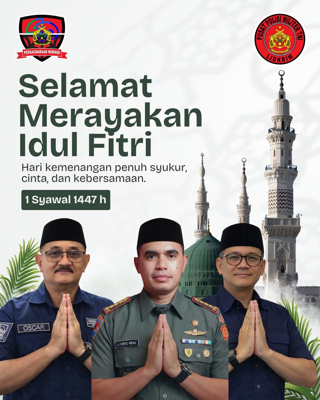 Jakarta ll gabungnyawartawanindonesia.co.id ll Dalam momentum perayaan Hari Raya Idul Fitri 1447 Hijriah, Persaudaraan Mimikri bersama Pusat Polisi Militer Tentara Nasional Indonesia (Puspom TNI) menyampaikan ucapan selamat kepada umat Muslim di seluruh Indonesia. Ucapan tersebut disampaikan melalui pernyataan resmi yang dipublikasikan di berbagai platform media.