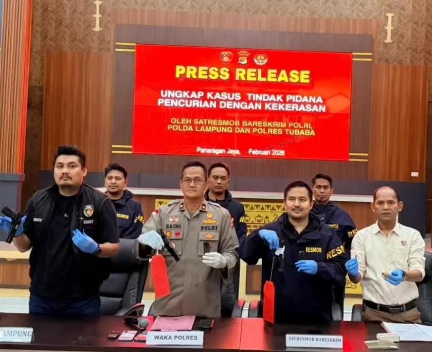 Lampung, gabungnyawartawanindonesia.co.id – Tim Satresmob Bareskrim Polri bersama Polda Lampung dan Polres Tulang Bawang Barat berhasil mengungkap kasus pencurian dengan kekerasan (curas) menggunakan senjata api yang terjadi di Kabupaten Tulang Bawang Barat, Lampung, Kamis (20/2/2026).