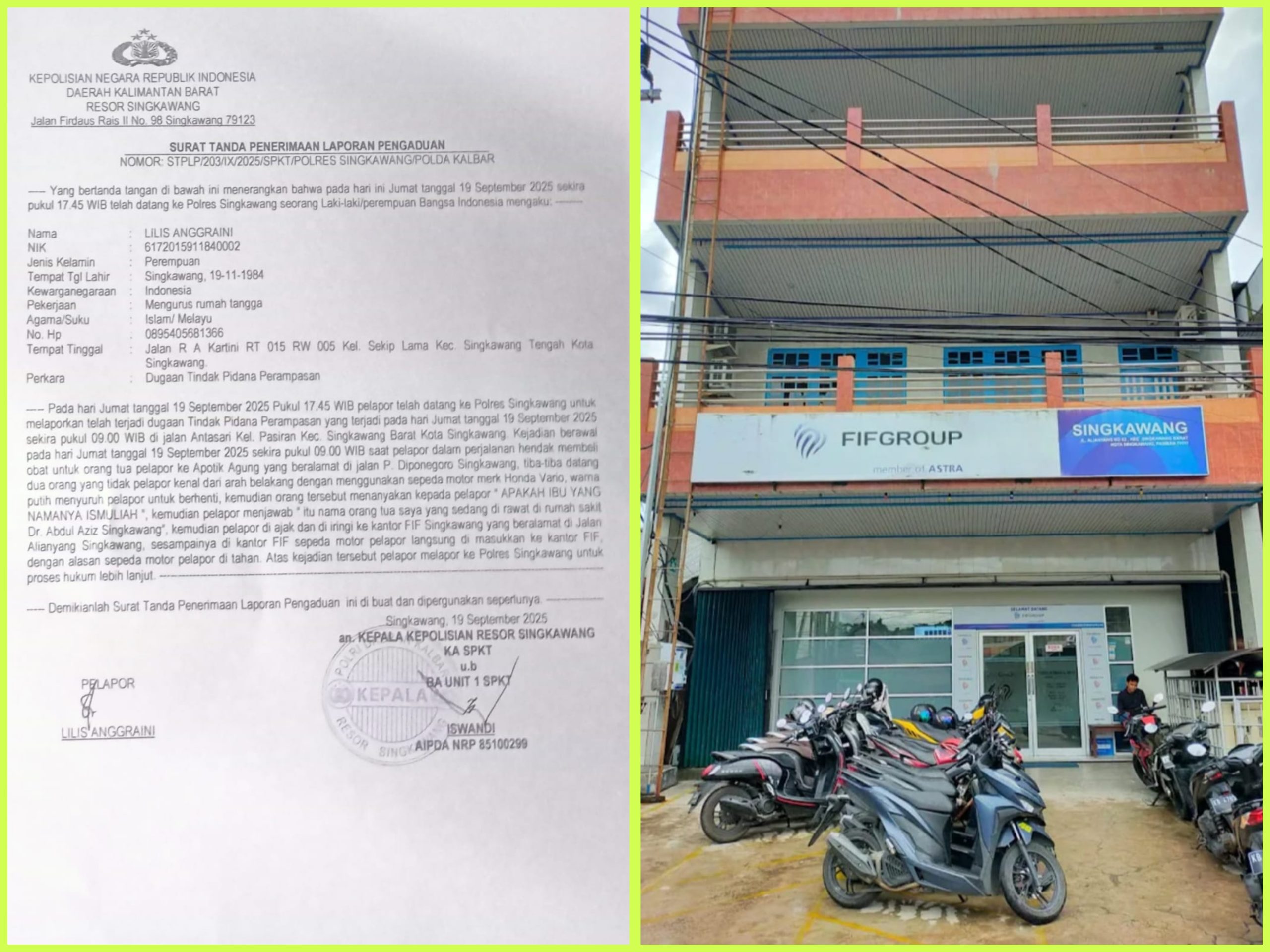 Lilis selaku korban perampasan motor oleh debt collector bernama Ucok langsung membuat kan laporan polisi dan diterima dengan nomor: 203/IX/2025/SPKT/Polres Singkawang yang didampingi oleh LBH Rakha sebagai penerima Kuasa dan berharap peristiwa yang dialaminya dapat diproses secara Hukum.