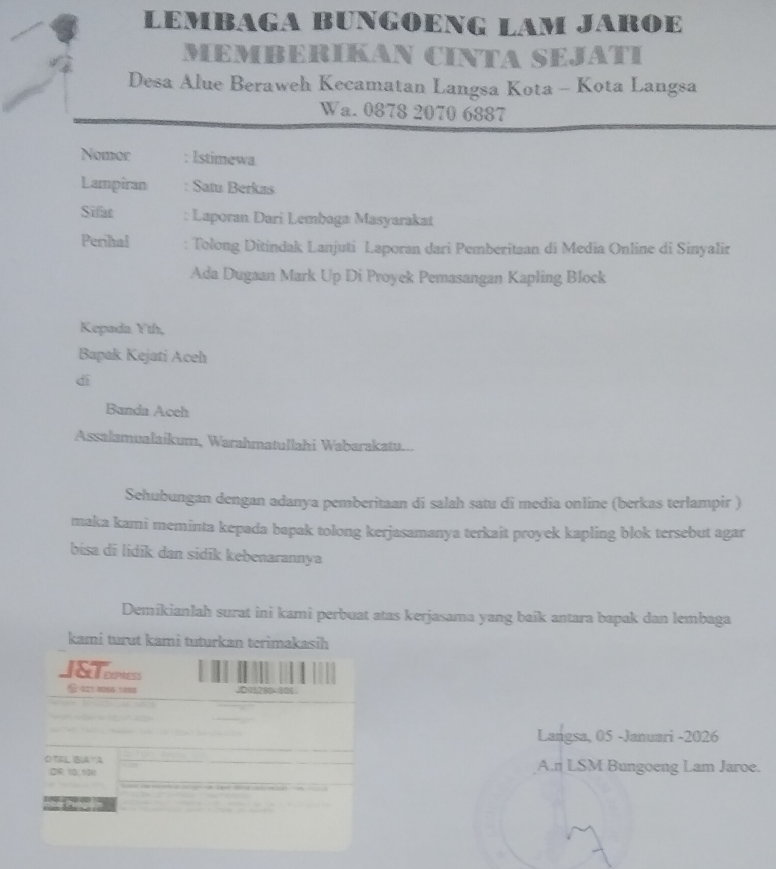 Dan di lanjuti pula, dari pihak aktivis lsm bungoeng lam jaroe aceh di kota langsa itu. Sempat pernah memberikan, dengan satu berkas dokumen. Yang telah berhasil dia layangkan ke pihak kepala kejaksaan tinggi aceh di banda aceh, yang berbunyi dalam dokumen surat lsm bungoeng lam jaroe aceh tersebut. Nomor : Istimewa, lampiran : Satu berkas, sifat : Laporan dari lembaga masyarakat, perihal : Tolong ditindak lanjuti, dari pemberitaan di media online, disinyalir ada dugaan mark-up di proyek pemasangan paving blok. Di tujukan, kepada yang terhormat (yth). Bapak kejati aceh di Banda aceh, di terbitkan langsa 05 januari 2026.