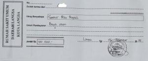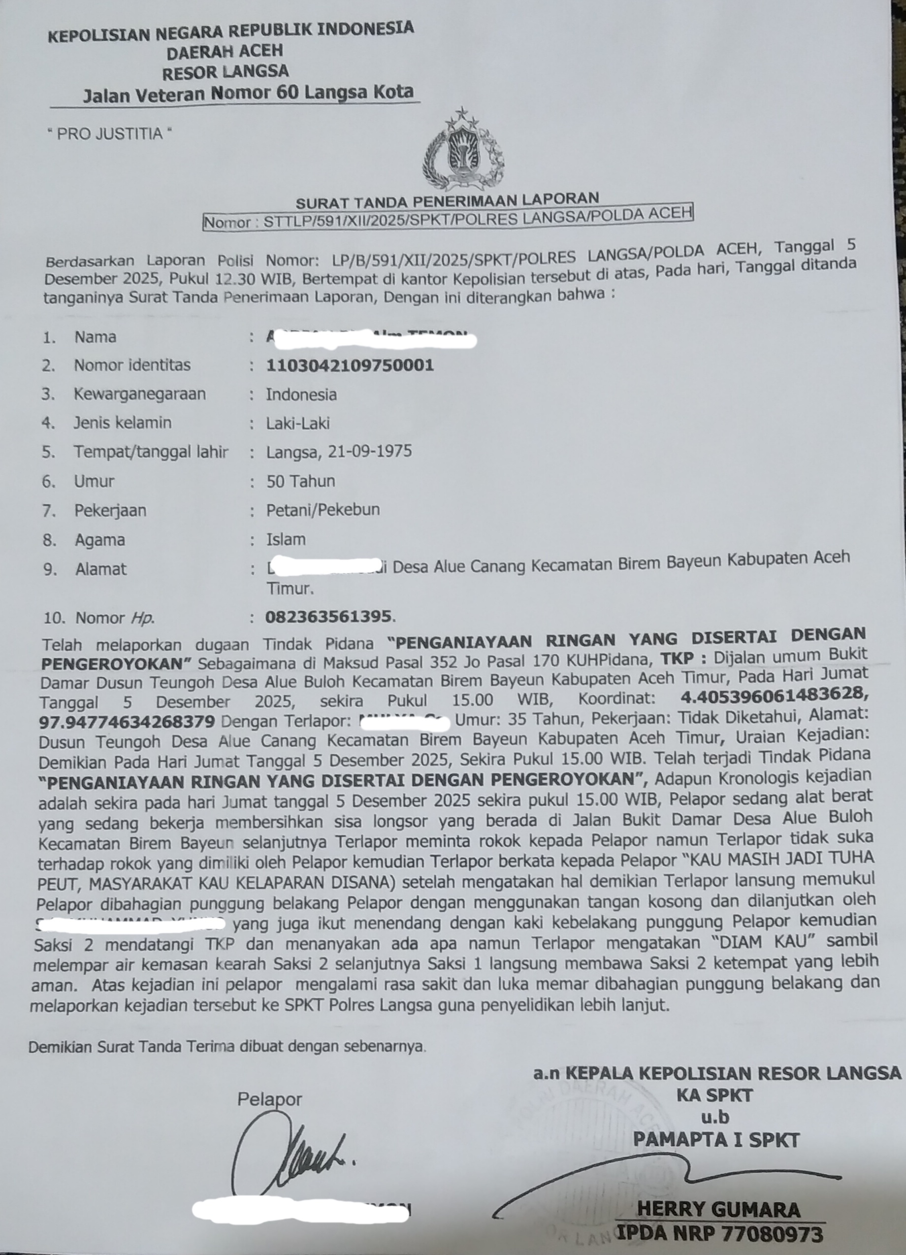 Demikian surat tanda terima di buat dengan sebenarnya, di tanda tangani pihak pelapor berinisial “A bin alm T” Dan juga di tanda tangani beserta berstempel basah polres langsa, atas nama (a.n) kepala kepolisian resort langsa. KA SPKT, u.b, PAMAPTA I SPKT, “HERRY GUMARA” Ipda NRP : 77080973.