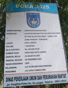Beberapa bulan ini saja, sudah terlihat retak-retak air. Yang terkesan pekerjaan pelaksanaan proyek itu, disinyalir asal-asalan jadi saja. Sesuai tampilan adanya plang papan nama nilai kontrak pekerjaan proyek tersebut, di tampilkan secara publik. Tertuliskan dan juga menyebutkan, doka 2025. Nomor kontrak, 19/sp/pupr/e-kat/doka/2025, pekerjaan. Lanjutan rehabilitas saluran sekunder gampong paya bujok seuleumak – ahmad yani (ayam tangkap-pemadam). Lokasi, kota langsa. Volume, 1 kegiatan. Nilai kontrak, Rp.935.008.275.00,- sumber dana. Doka 2025 kota langsa, tanggal mulai. 22 agustus 2025, tanggal selesai. 20 desember 2025, tahun anggaran 2025.