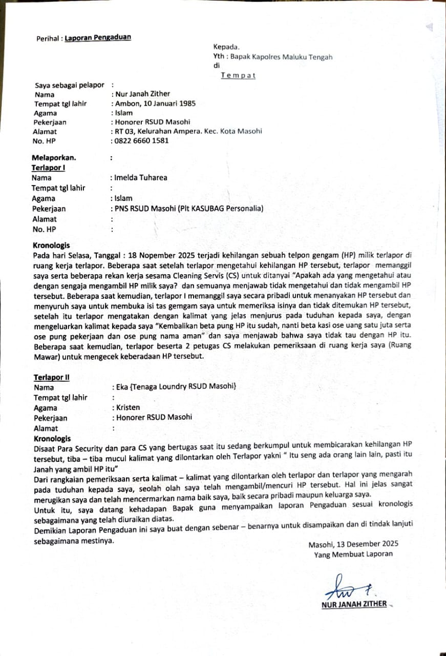 Laporan pengaduan tersebut disampaikan langsung kepada Kapolres Maluku Tengah, dengan terlapor Imelda Tuharea, seorang PNS RSUD Masohi yang menjabat sebagai Plt Kasubag Personalia, serta Eka, tenaga laundry honorer RSUD Masohi.17/12/25