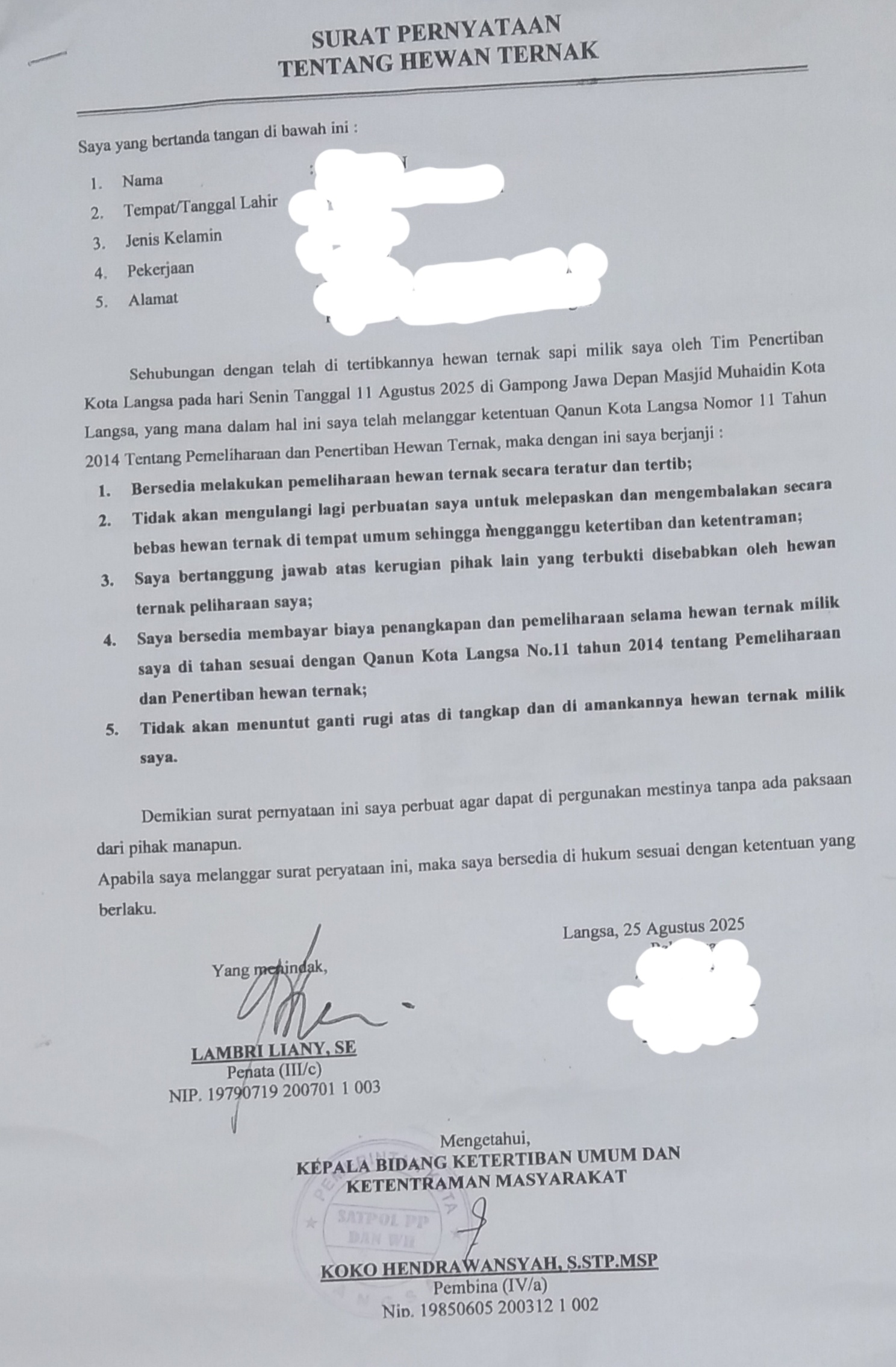 Kemarin, beberapa pekan lalu. Langsung dari tangan pemilik ternak lembu itu, di sebut-sebut sapaan panggilan “khalidin”. Yang berbunyi di dalam surat pernyataan tentang hewan ternak, yang telah di perbuat oleh pihak sat-pol-pp pemerintahan kota (pemko) langsa. Pada poin nomor 4, berbunyi saya bersedia membayar biaya penangkapan dan pemeliharaan selama hewan ternak milik saya di tahan sesuai qanun kota Langsa. Dengan nomor 11 tahun 2014, tentang pemeliharaan dan penertiban hewan ternak. Di perbuat surat tersebut, langsa 25 agustus 2025 beberapa bulan yang lalu.