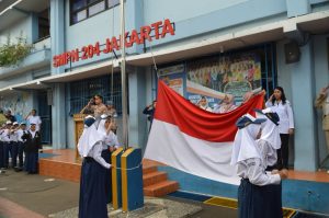 Kapolsek Kalideres Kompol Arnold Julius Simanjuntak, S.E., S.I.K., M.H, hadir sebagai Pembina Upacara Bendera di SMPN 204 Jakarta, Kelurahan Pegadungan, Kalideres, Jakarta Barat.