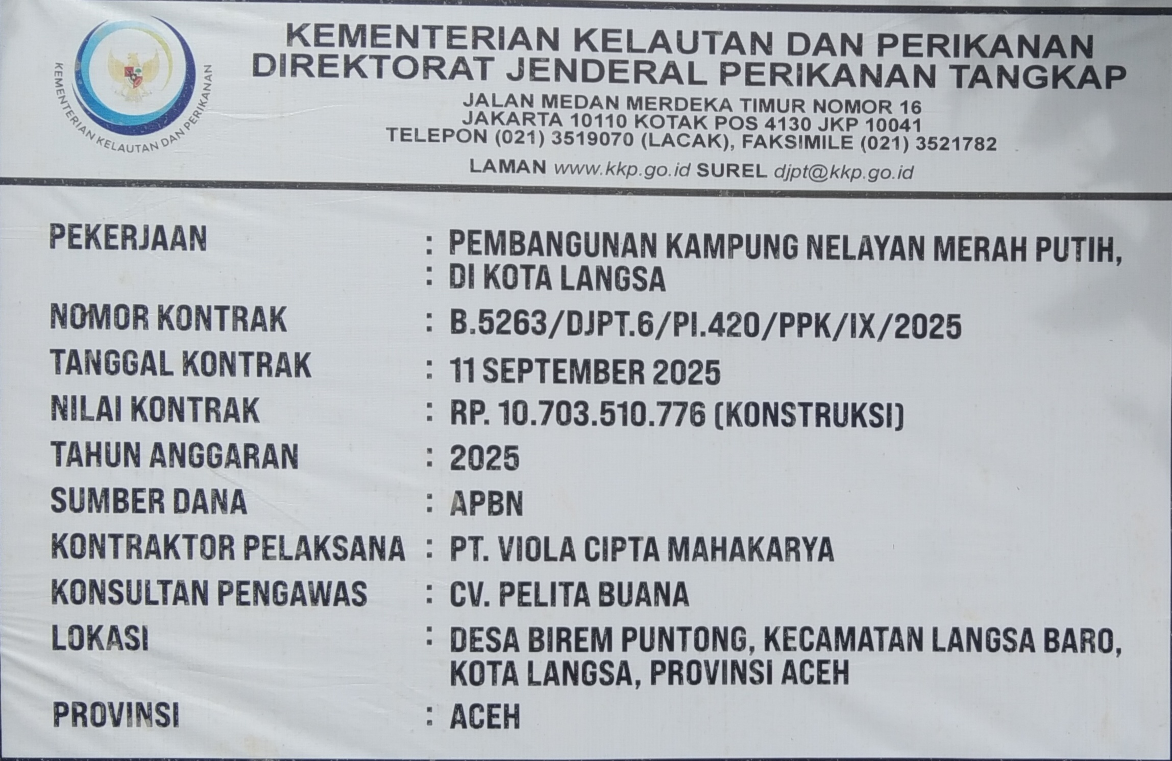 Pekerjaan, pembangunan kampung nelayan merah putih di kota langsa-aceh. Nomor kontrak, B.5263/DJPT.6/PI.420/PPK/IX/2025. Tanggal kontrak, 11 september 2025. Nilai kontrak Rp.10.703.510.776,- (kontruksi). Tahun anggaran, 2025. Sumber dana, APBN. Kantor pelaksana, PT viola cipta mahakarya. Konsultan pengawas, cv pelita buana. Lokasi, desa birem buntung kecamatan langsa baro kota langsa provinsi aceh.