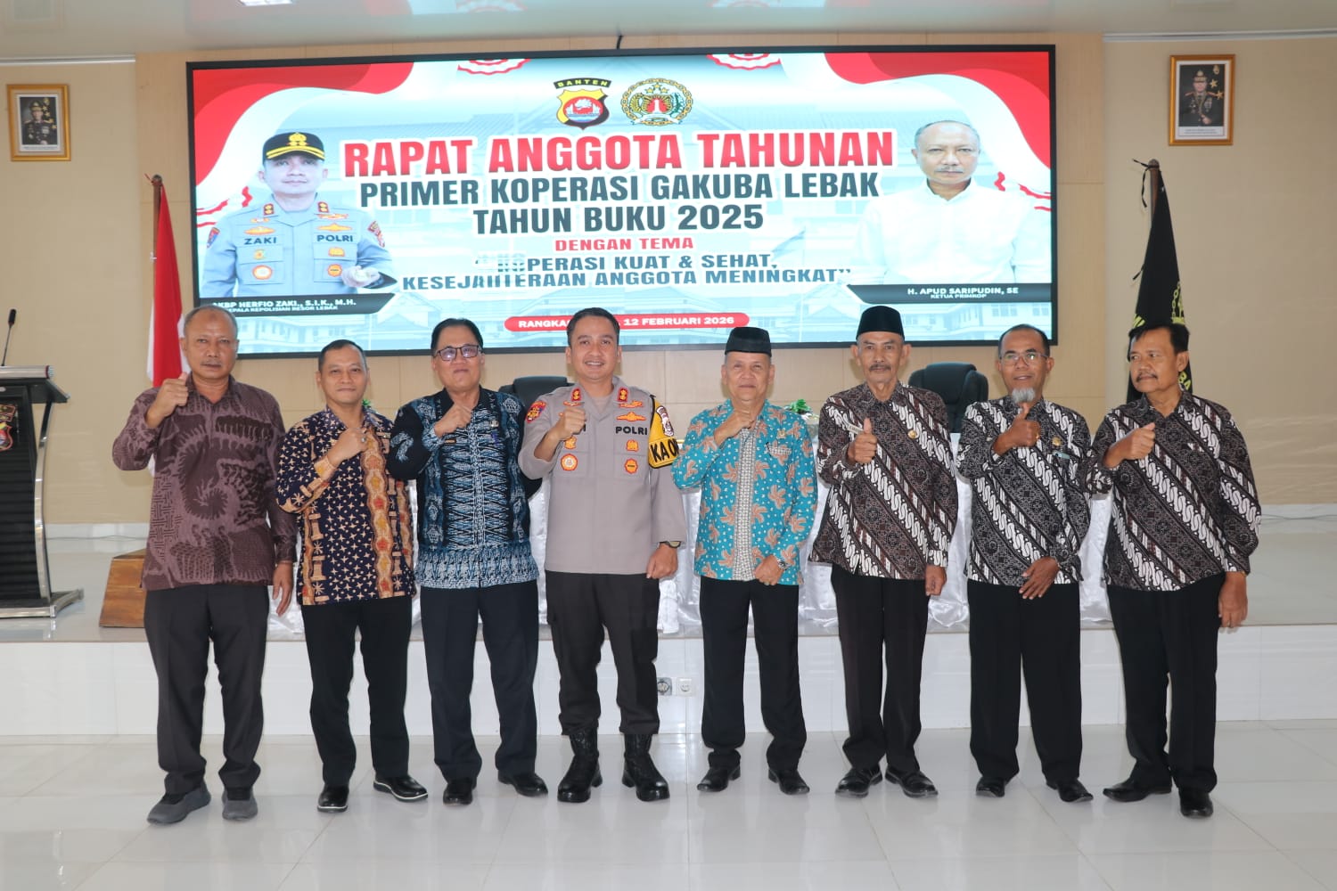 Kapolres Lebak AKBP Herfio Zaki, S.I.K., M.H membuka secara resmi Rapat Akhir Tahunan (RAT) Primer Koperasi Gakuba Lebak Tahun Buku 2025 dengan tema “Koperasi Kuat dan Sehat, Kesejahteraan Anggota Meningkat”. Kegiatan tersebut dilaksanakan di Aula Sanika Satyawada Polres Lebak pada Kamis (12/2/2026).