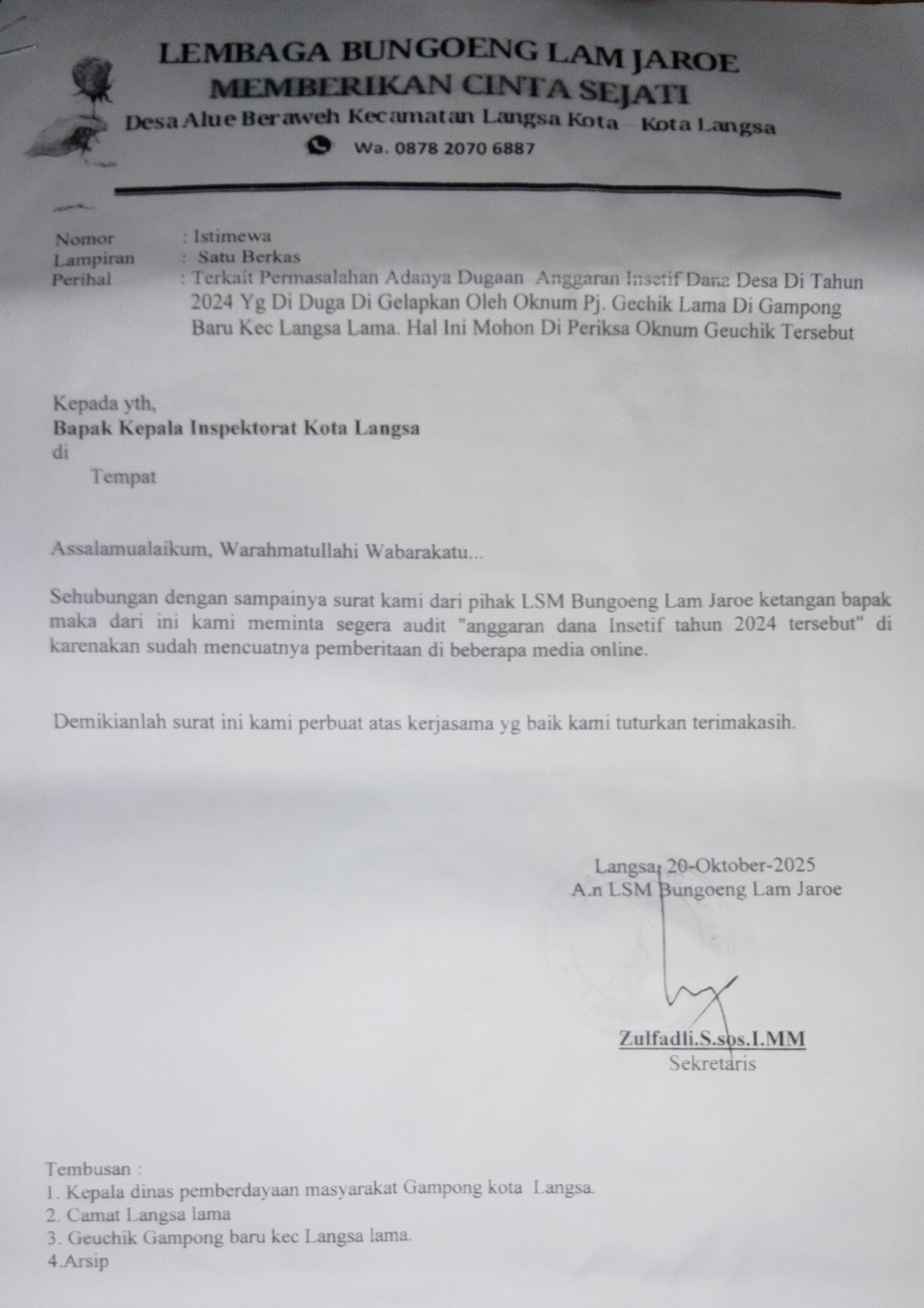 Langsa 20 oktober 2025, atas nama (A.N) lsm bungoeng lam jaroe. Di tanda tangani serta berstempel basah, “zulfadli.s,sos.i,mm). Tembusan masing-masingnya : 1, kepala dinas pemberdayaan masyarakat gampong kota langsa. 2, camat langsa lama. 3, geuchik gampong baro kecamatan langsa lama. 4, arsip.