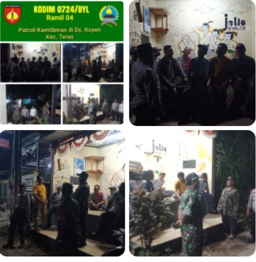 Boyolali, gabungnyawartawanindonesia.co.id., – Komitmen menjaga keamanan wilayah terus ditunjukkan Babinsa Koramil 04/Teras Kodim 0724/Boyolali Pelda Heru Purnomo dengan turun langsung melaksanakan patroli Siskamling di Desa Kopen, Kecamatan Teras, Kabupaten Boyolali, (19/02/2026). Kehadirannya di tengah ronda malam menjadi suntikan semangat bagi warga dalam menjaga lingkungan tetap aman dan kondusif.