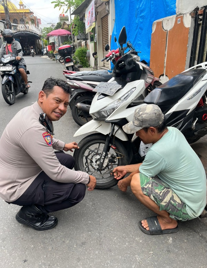 Dalam suasana yang akrab dan humanis, Bhabinkamtibmas memberikan edukasi pentingnya penggunaan kunci ganda dan gembok tambahan pada kendaraan bermotor.
