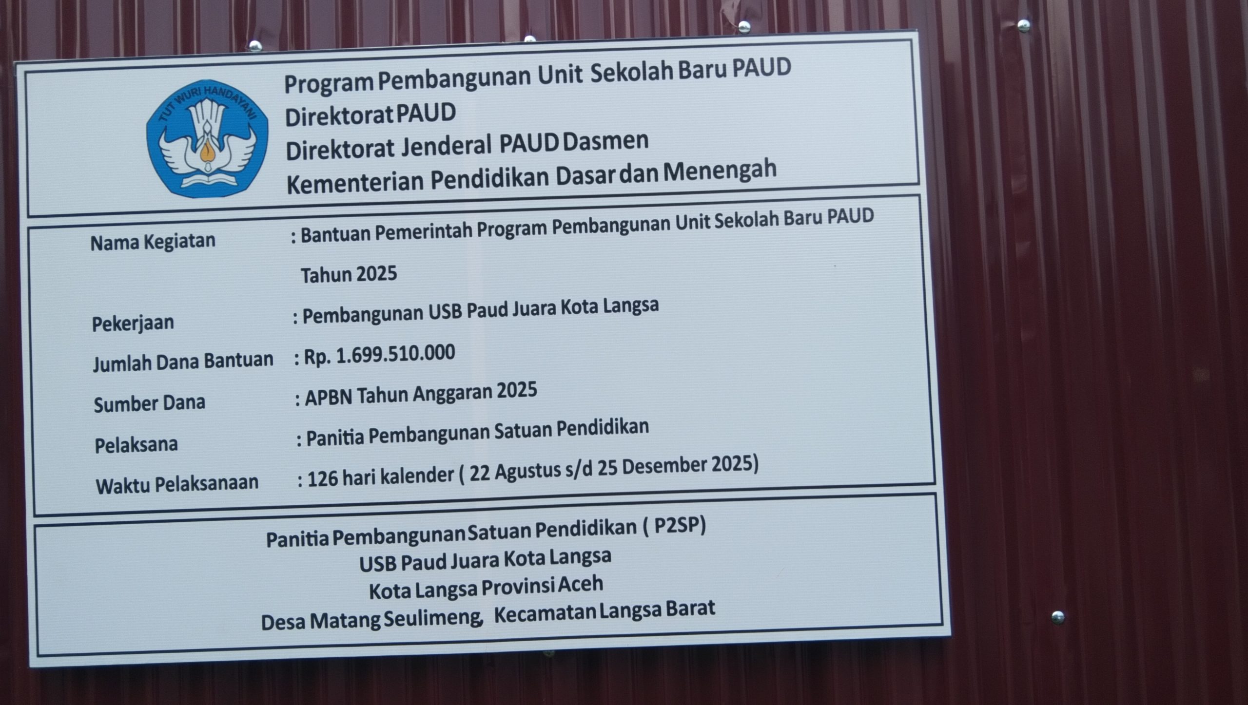 Dengan nama kegiatan, bantuan pemerintah program pembangunan unit sekolah baru paud tahun 2025. Pekerjaan, pembangunan usb paud juara kota langsa. Jumlah dana bantuan, Rp.1.699.510.000, sumber dana. APBN anggaran tahun 2025, pelaksana. Panitia pembangunan satuan pendidikan, waktu pelaksana. 126 hari kalender (22 agustus sampai dengan 25 desember 2025), dengan panitia pembangunan satuan pendidikan (P2SP) usb paud juara kota langsa provinsi aceh, desa matang seulimeng kecamatan langsa barat.