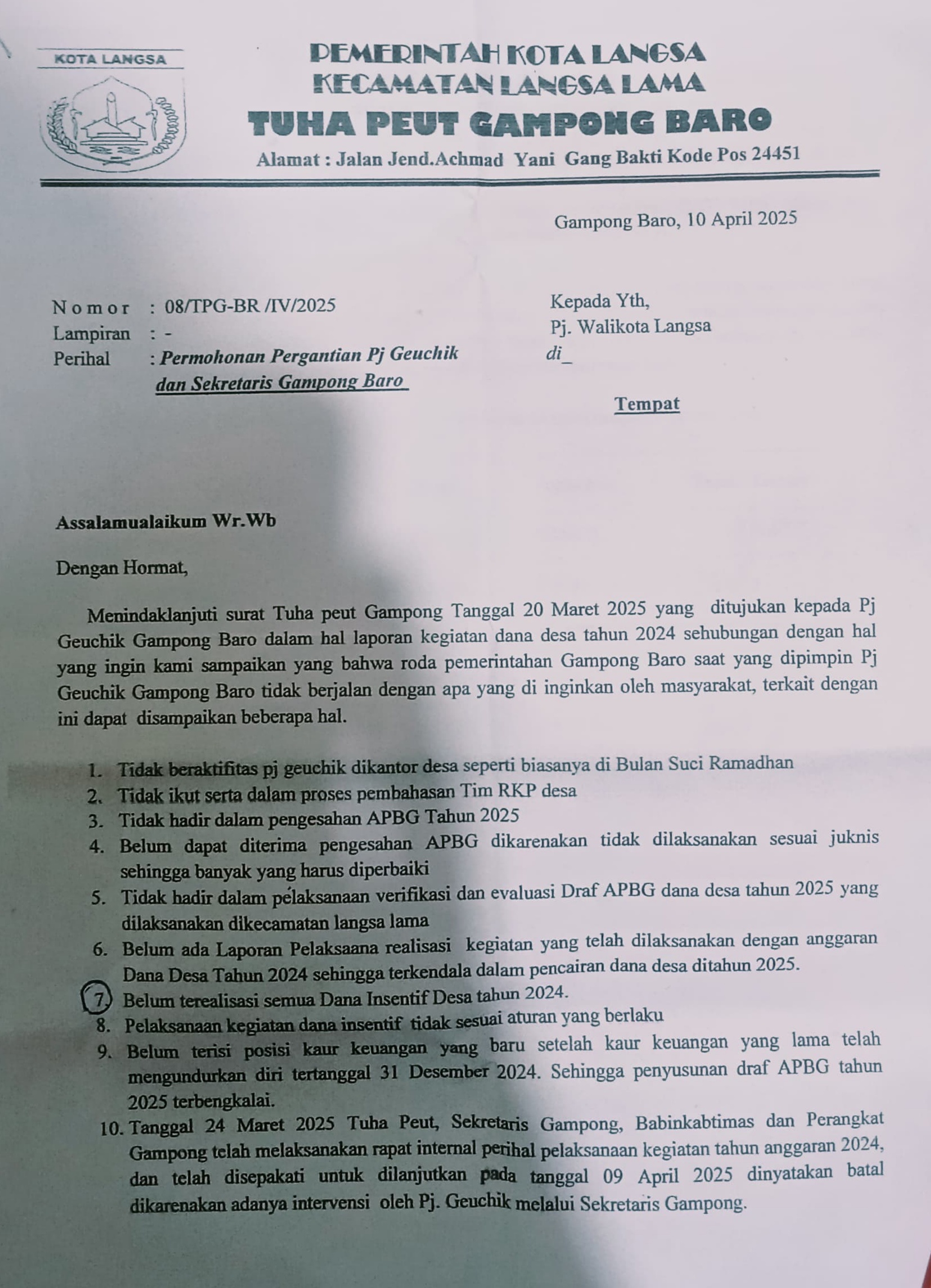 Dengan atas tudingan, oleh pihak beberapa oknum perangkat desa gampong baro kecamatan langsa lama kota langsa provinsi aceh. Dengan pihak mantan geuchik gampong baro, yang disebut-sebut nama sapaan panggilannya “Mahdi”. Setelah terjadi ke gadohan, dan tudingan dugaan fitnah (pencemaran) nama baiknya itu. Dengan sejumlah dan desa (TPK), yang senilai mencapai Rp.81.354.000, juta rupiah di tahun 2024 lalu.
