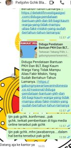 Akan di daftarkan PKH dan BLT miliknya saya, sementara itu. Dari pihak kaur perangkat desa, yang membidangi itu. Menjelaskan juga, kepada kadus tersebut. Kaur itu, menjabarkan di hadapan saya. Mau kemana lagi bapak Kadus daftar kan, berinisial R itu. Mana bisa lagi di daftarkan, paling tahun depan lah ibuk tersebut bisa dapat.