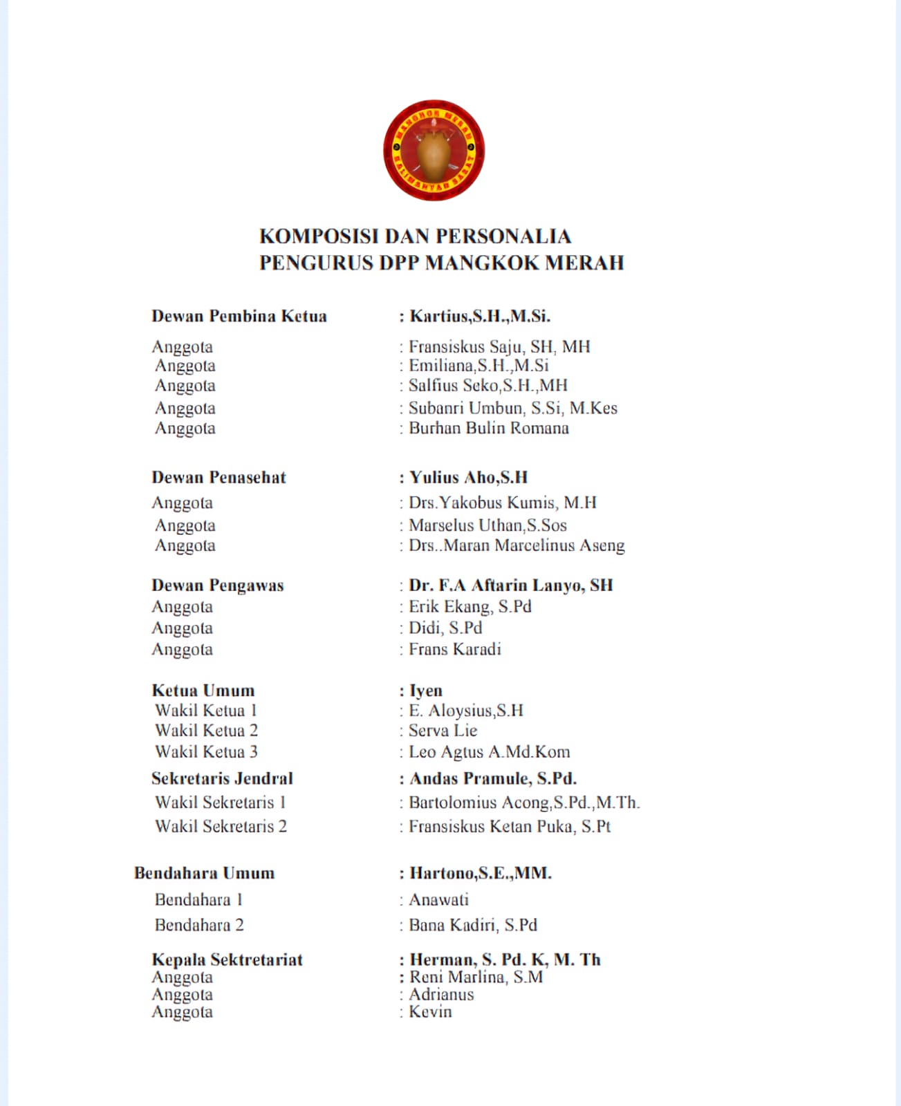 Berikut struktur lengkap dan daftar sesepuh serta pengurus inti DPP Ormas Mangkok Merah Kalimantan Barat: