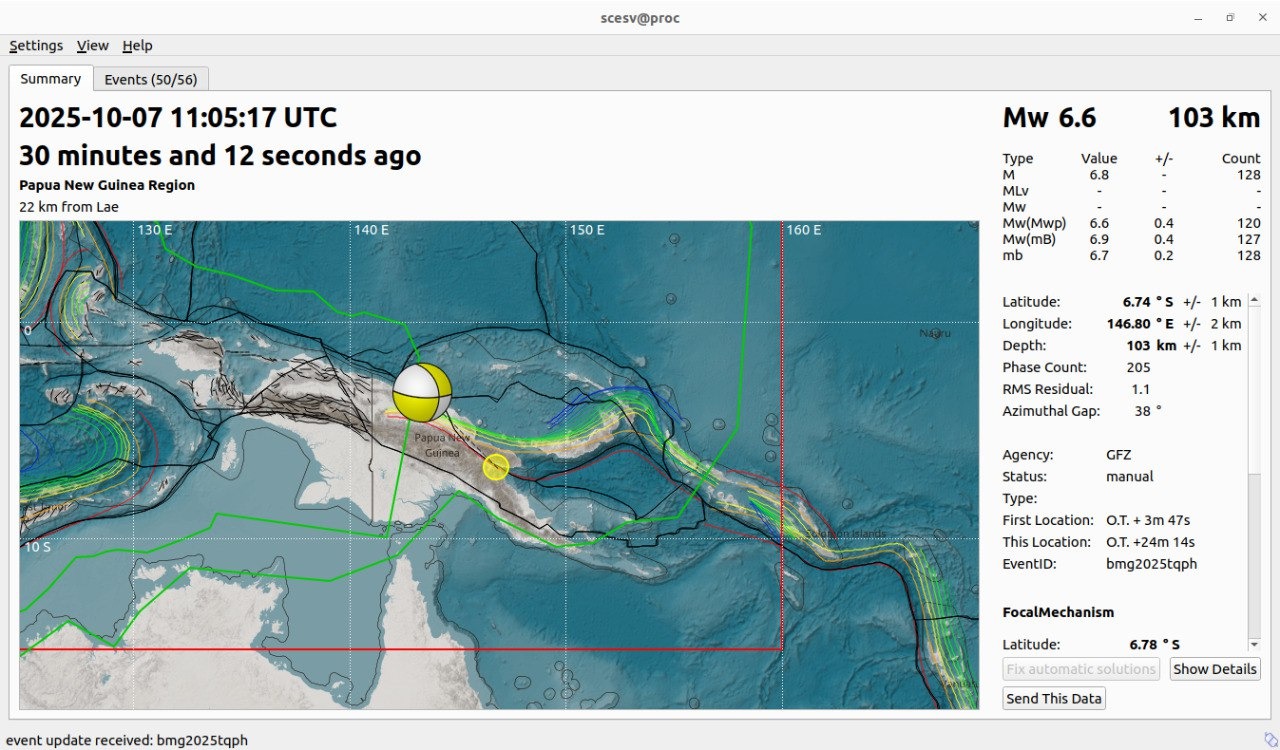 Pada hari Selasa, 07 Oktober 2025, pukul 18:05:17 WIB di Lae, Papua New Guinea diguncang gempabumi tektonik. Hasil analisis BMKG menunjukkan gempabumi ini memiliki magnitudo M6.6 dengan episenter terletak pada koordinat 6.784°LS 146.767°BT pada kedalaman 99.4 km.