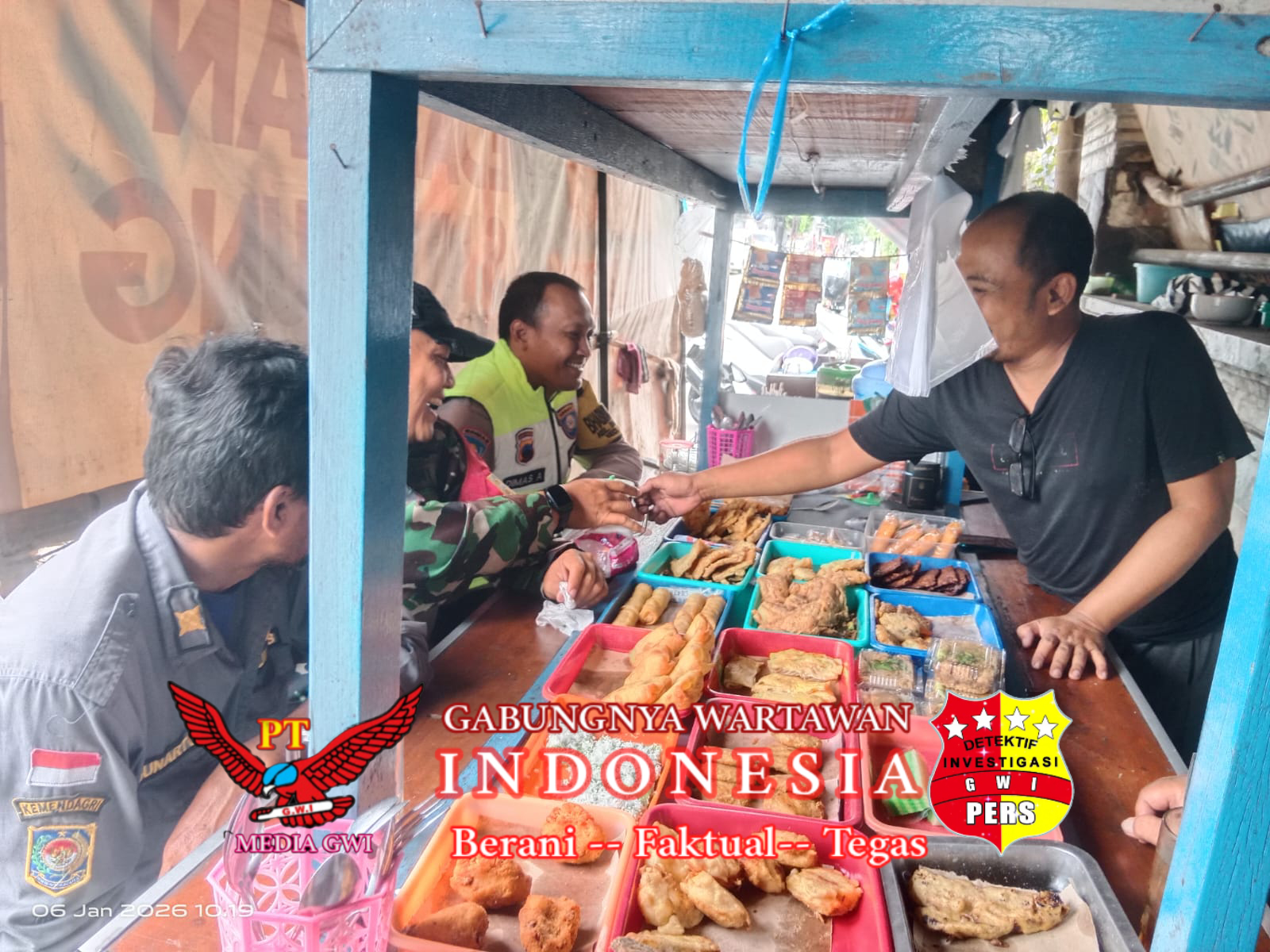 Babinsa Danukusuman Koramil 03/Serengan Kodim 0735/Surakarta Serda Tito sedang berinteraksi dengan Bhabinkamtibmas dan Warga di wedangan Pak Kuncung Jl Pattimura Danukusuman Serengan Kota Surakarta, Selasa (13/01/2026)