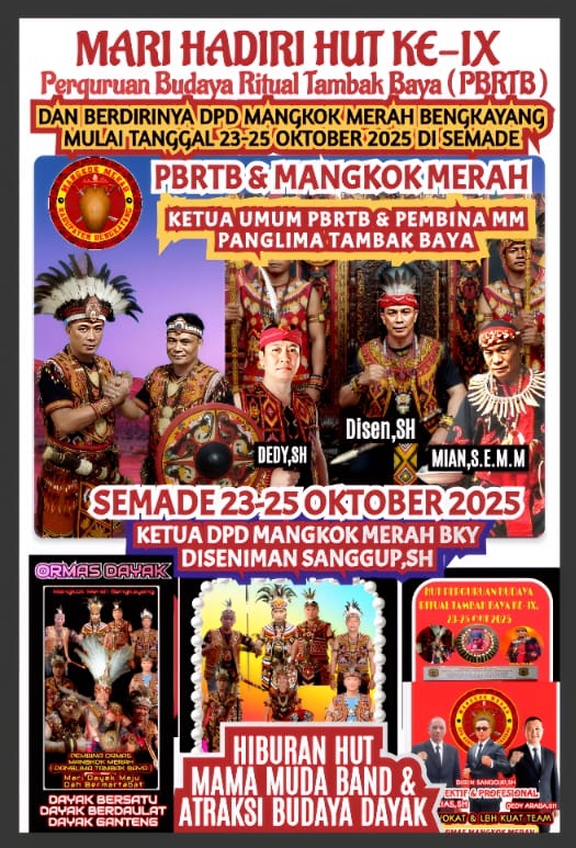 Landak,gabunganwartawanindonesia.co.id – Perayaan Hari Ulang Tahun (HUT) ke-IX Persaudaraan Bela Raga Tradisional Borneo (PBRTB) sekaligus peringatan berdirinya DPD Mangkok Merah Kabupaten Bengkayang akan dilaksanakan di Desa Semade, Kecamatan Banyuke Hulu, Kabupaten Landak, pada Kamis 23–25 Oktober 2025 mendatang.