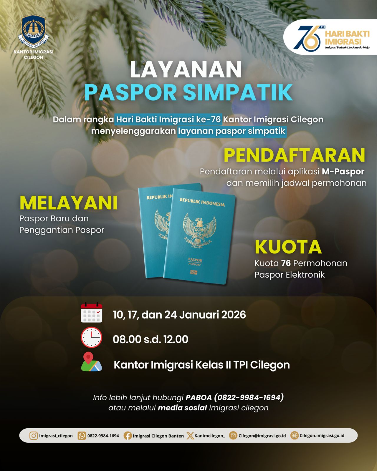 GabungnyawartawanIndonesia.co.id. Cilegon,— Dalam rangka memperingati Hari Bakti Imigrasi ke-76, Kantor Imigrasi Kelas II TPI Kota Cilegon menggelar Layanan Paspor Simpatik sebagai wujud nyata komitmen peningkatan kualitas pelayanan publik sekaligus upaya edukasi kepada masyarakat mengenai pentingnya kepemilikan dokumen perjalanan yang sah dan sesuai ketentuan hukum.