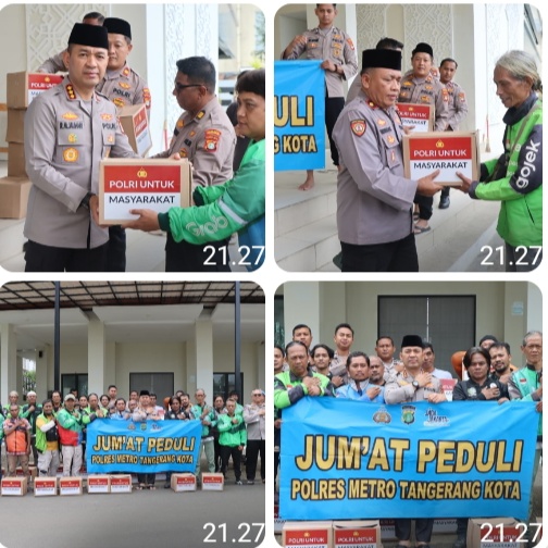 Tangerang, gabungnyawartawanindonesia.co.id., – Wujud kepedulian terhadap masyarakat terus ditunjukkan jajaran Polres Metro Tangerang Kota. Melalui program rutin “Jumat Peduli”, Kapolres Metro Tangerang Kota Kombes Pol. Dr. Raden Muhammad Jauhari, S.H., S.I.K., M.Si. membagikan paket sembako kepada komunitas ojek online (ojol) Kota Tangerang, Sabtu (21/2/2026).