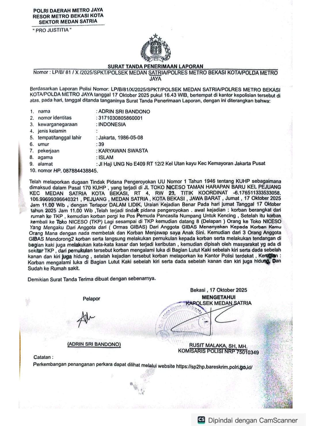 Bekasi |gabungnyawartawanindonesia.co.id.- Seorang warga bernama Andrin Sri Bandono melaporkan dirinya menjadi korban pengeroyokan yang diduga dilakukan oleh sekelompok orang dari salah satu organisasi masyarakat (ormas) di wilayah Kota Bekasi. Peristiwa tersebut terjadi pada 17 Oktober 2025, dan hingga kini, menurut pengakuan korban, kasus tersebut belum menunjukkan perkembangan berarti.