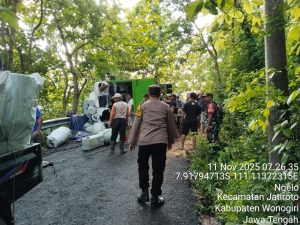Wonogiri – gabungnyawartawanindonesia.co.id ll Sebuah truk bermuatan plastik perabot rumah tangga dengan nomor polisi W-8695-B mengalami kecelakaan tunggal di jalur tanjakan Jl. Raya Jatiroto–Tirtomoyo, tepatnya di Dusun Dawe Kidul, Desa Ngelo, Kecamatan Jatiroto, pada Selasa (11/11/2025) sekitar pukul 05.30 WIB.