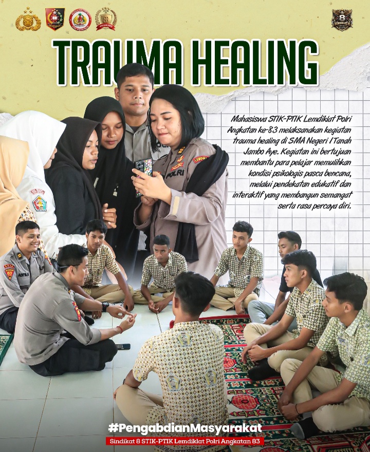 Aceh Utara, gabungnyawartawanindonesia.co.id., – Sebagai bagian dari rangkaian kegiatan Pengabdian Masyarakat (Dianmas), Mahasiswa STIK Lemdiklat Polri Angkatan 83/WPS Sindikat 8 melaksanakan kegiatan trauma healing di SMAN 1 Tanah Jambo Aye, Kabupaten Aceh Utara, Minggu (22/02/2026) pukul 13.00 WIB.