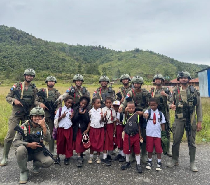 Menjelang akhir patroli, para personel kembali melanjutkan pemantauan di sekitar kampung sebelum meninggalkan lokasi. Sementara itu, anak-anak kembali ke ruang kelas dengan wajah ceria, meninggalkan jejak kecil dari pertemuan singkat yang menghadirkan rasa aman sekaligus kehangatan di Kampung Kabiding.