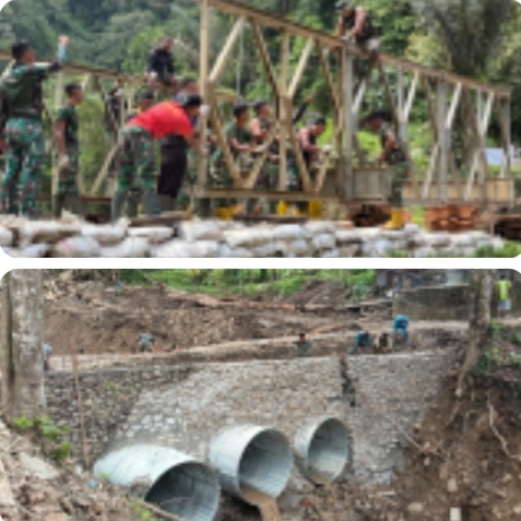 Anggota TNI dari Bekangdam XX/Tanjungpura (TIB) terus bergerak membangun berbagai jenis jembatan, mulai dari jembatan Bailey, jembatan Armco, hingga jembatan gantung, di sejumlah kabupaten di Sumatera Barat. Pembangunan difokuskan pada titik-titik akses vital yang terputus akibat banjir.