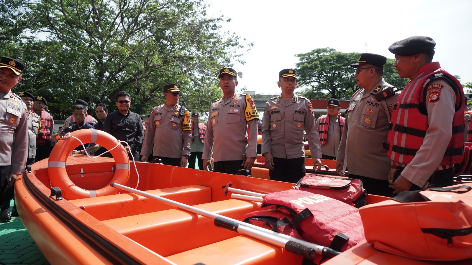 Dalam kesempatan tersebut, Kapolres melakukan pengecekan langsung terhadap peralatan siaga bencana seperti Mesin skiff boat, Tilker extension, Tangga naik, Alat tambah dan pengikat, Life vest, Dayung, Boat hook, Ring buoy, Boat cover, Skiff dolly, P3K, Lampu emengency dan dudukan, Tandu lipat, Bolder skiff, Repling tali tebing, Tali tebing pengikat, Mesin potong/chainsaw