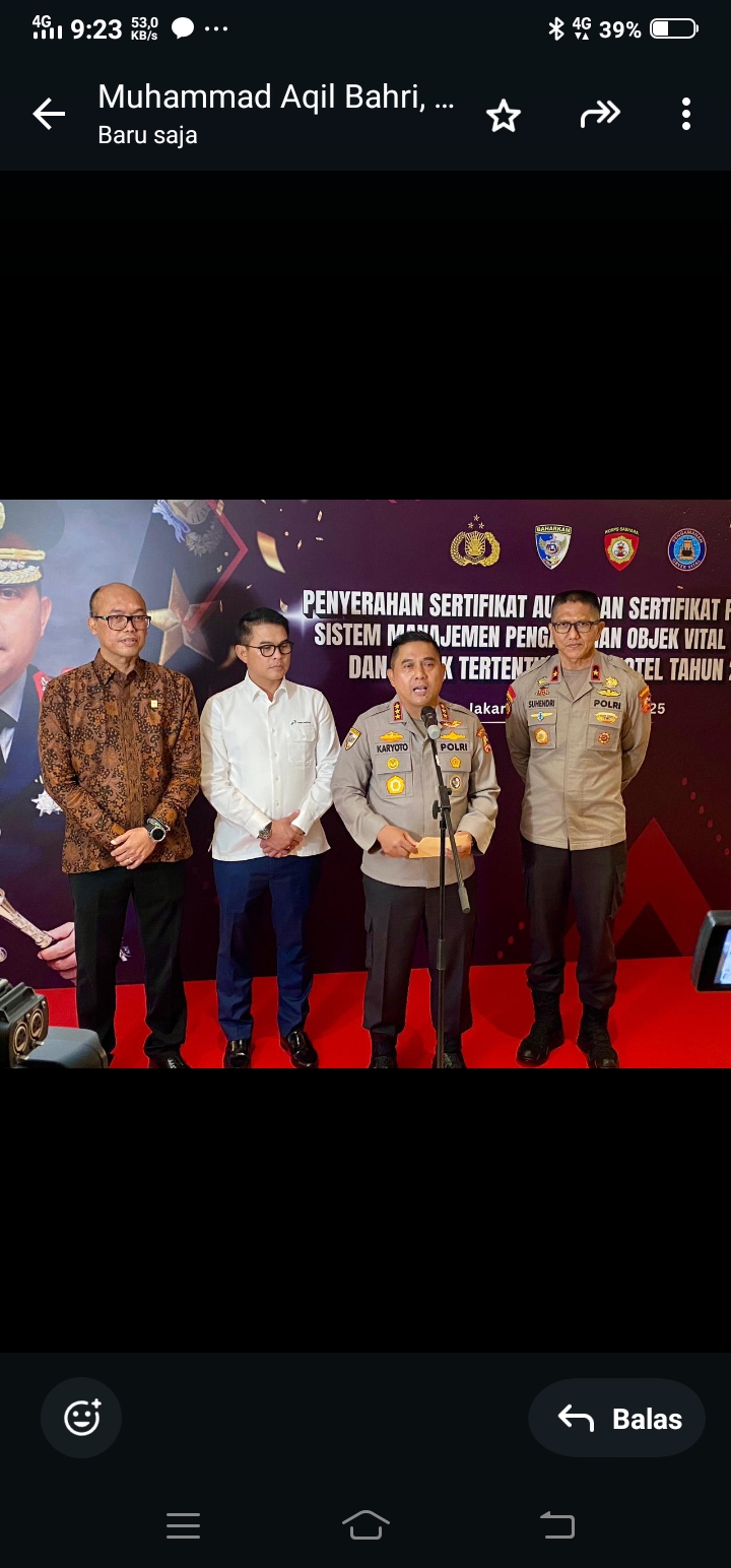 Jakarta, gabungnyawartawanindonesia.co.id., — Badan Pemelihara Keamanan (Baharkam) Polri secara simbolis menyerahkan Sertifikat Audit Penerapan Sistem Pengamanan Objek Vital Nasional dan Objek Tertentu serta Hotel Tahun 2025. Kegiatan tersebut berlangsung di Gedung Auditorium Lantai 3 PT PLN (Persero), Senin (15/12/2025), sekitar pukul 10.45 WIB.