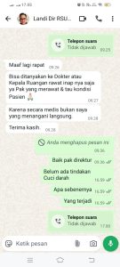 Lanjut tadi Saya mencoba kompermasi melalui via w,a kepada pihak direktur RSUD bapak dr. H. Lendy Delyanto, MARS.