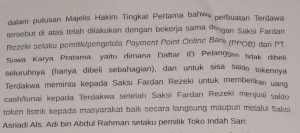 Berlanjut, pada nomor urutan ke 5. Dengan alenia tulisan menuju akhir itu, menyebutkan. Dalam putusan majelis hakim tingkat pertama, bahwa perbuatan terdakwa tersebut. Di atas telah dilakukan dengan bekerja sama, dengan saksi bernama “Fardan Rezeki”. Selaku pemilik/pengelola (Payment Point Online Bank) alias PPOB dari PT suwa karya pratama, yaitu. Dimana daftar ID Pelanggan, tidak dibeli seluruhnya (hanya dibeli sebahagian). Dan untuk sisa saldo token nya, terdakwa meminta kepada saksi “Fardan Rezeki”. Untuk memberikan uang cash/tunai kepada terdakwa, setelah saksi “Fardan Rezeki”. Menjual saldo token listrik, kepada masyarakat. Baik secara langsung, mau pun melalui saksi, bernama “asriadi alias adi bin abdul rahman” selaku pemilik toko indah sari.