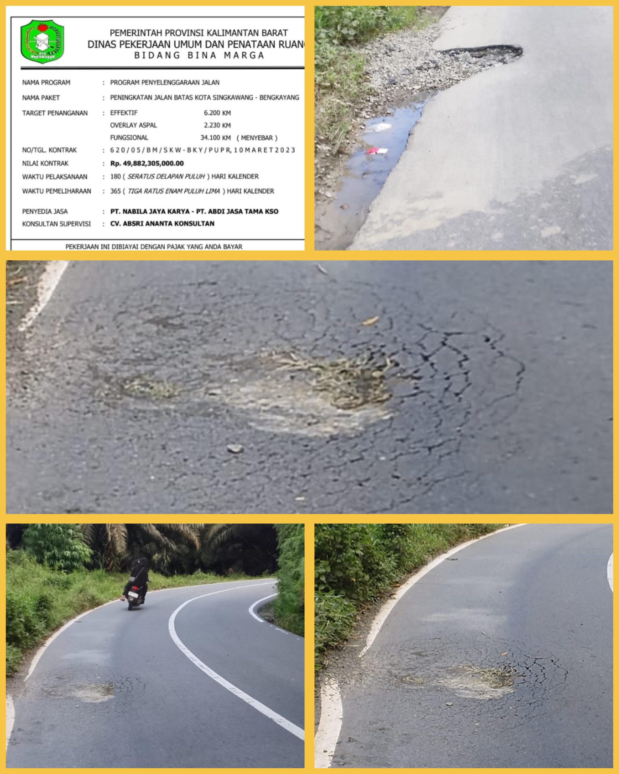 Proyek tersebut diketahui dikerjakan oleh PT Nabila Jaya Karya – PT Abdi Jasa Tama (KSO) dengan Konsultan Supervisi, berdasarkan Nomor Kontrak: 620/05/BM/SKW-BKY/PUPR, tertanggal 10 Maret 2023, dengan nilai kontrak mencapai Rp 41.882.305.000,00. Proyek ini bersumber dari uang pajak masyarakat, yang seharusnya dikelola secara profesional dan bertanggung jawab.