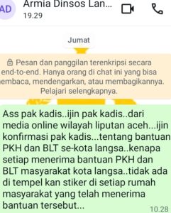 Yang mana yang layak dapat menerima bantuan PKH, BLT serta juga BPNT. Yang seharusnya juga, sesuai anjuran dan aturan dari pemerintahan pusat kementerian dari jakarta. Memasang masing-masing dan menempel stiker yang pantas menerimanya, bagi lansia yang kurang mampu (miskin). Anehnya lagi, ketika wartawan media online ini. Mencoba melakukan jafrian konfirmasi kepada salah satu seorang pejabat utama (kepala dinas sosial) kadinsos pemko langsa-aceh tersebut. Yang di sebut-sebut sapaan panggilan “armia”, melalui seluler chat whatsapp selularnya itu. Di nomor selularnya, 081361xxxx03. Tentang, bantuan PKH dan BLT se-kota langsa..kenapa setiap menerima bantuan PKH dan BLT masyarakat kota langsa..tidak ada di tempel kan stiker di setiap rumah masyarakat yang telah menerima bantuan tersebut…terkirim kepadanya kadinsos langsa “armia” itu, namun. Dirinya terkesan tidak melakukan jawaban apa pun, disinyalir membungkam.