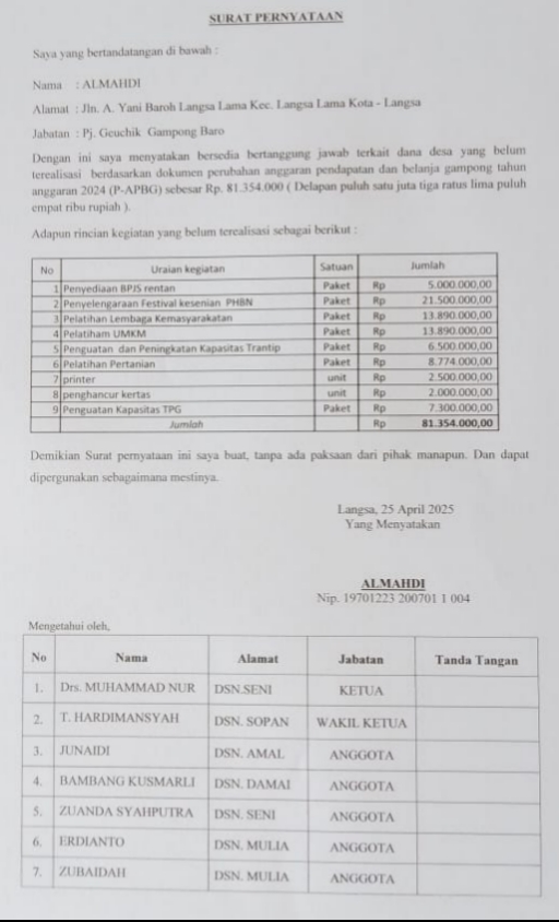Yang pada sebelumnya juga, pihak ketua tuha phet desa gampong baro kecamatan langsa lama kota langsa tersebut. Sempat pernah diduga melakukan paksaan untuk membuat surat pernyataan, dugaan tuduhan terhadap mantan pj gechik “Almahdi” pada tahun 2024 lalu. Dengan surat tersebut, yang akan berupa untuk menuduh atas dana anggaran TPK yang senilai sekitar Rp.81 juta rupiah itu.