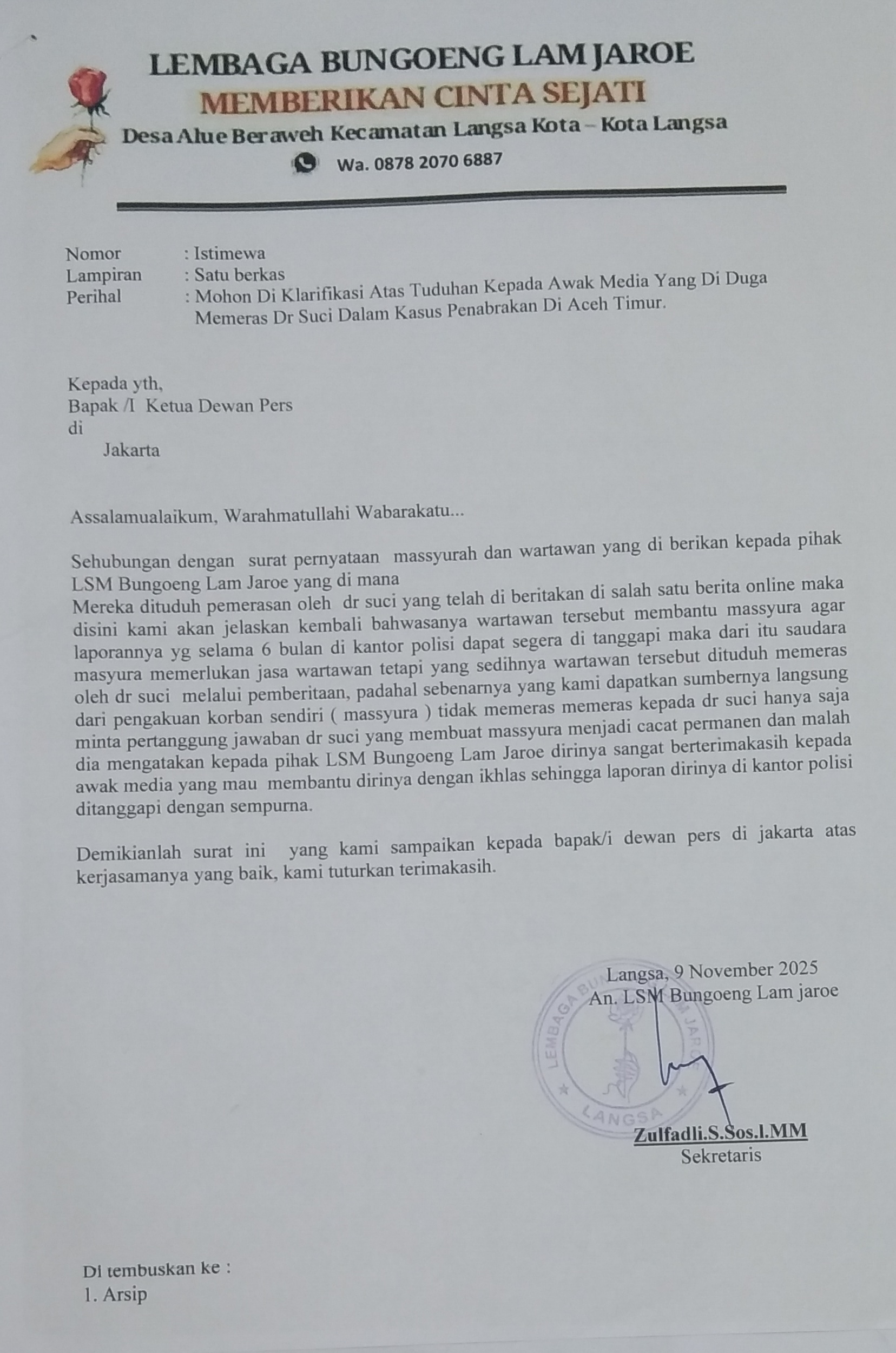 Di dalam hasil surat yang telah di layangkan oleh pihak lsm bungoeng lam jaroe aceh di aceh timur itu. Ke kantor dewan pers di jakarta, menjelaskan, nomor : Istimewa, lampiran : satu berkas, perihal : Mohon di klarifikasi atas tuduhan kepada awak media, yang diduga memeras dr suci. Dalam kasus, penabrakan di aceh timur. Di tujukan kepada yang terhormat (yth) bapak/ibu ketua dewan pers di jakarta. Dan di perbuat, langsa 9 november 2025. Atas nama (a.n) LSM bungoeng lam jaroe, di tanda tangani oleh “zulfadli s sos i mm” sekretaris juga bercap stempel basah.