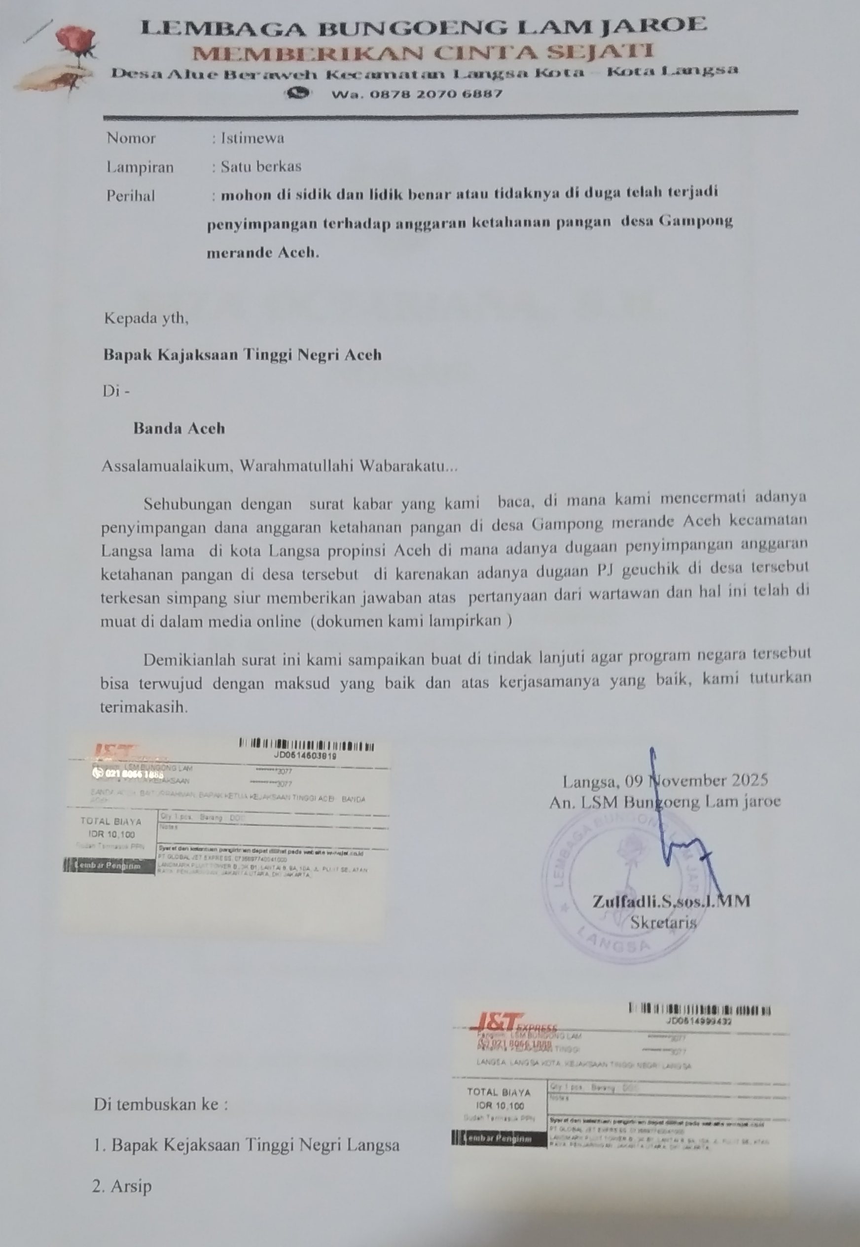 Di tujukan, kepada yang terhormat (yth). Bapak kejaksaan tinggi (kejati) aceh di banda aceh, langsa 09 november 2025. Atas nama (A.N) LSM bungoeng lam jaroe, di tanda tangani oleh “zulfadli s sos i mm” selaku sekretaris. Dan bercap stempel basah lsm BLJ aceh, di tembuskan ke : 1, bapak kejaksaan negeri langsa. 2, arsip.