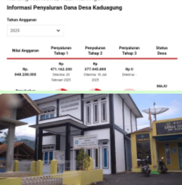 Berdasarkan penelusuran data, total Dana Desa yang diterima Kaduagung selama 2019–2025 mencapai Rp 5.804.384.000. Dari jumlah tersebut, Dana Desa yang tercatat tersalurkan sebesar Rp 5.375.857.500, dengan total sisa anggaran Rp 428.526.500.