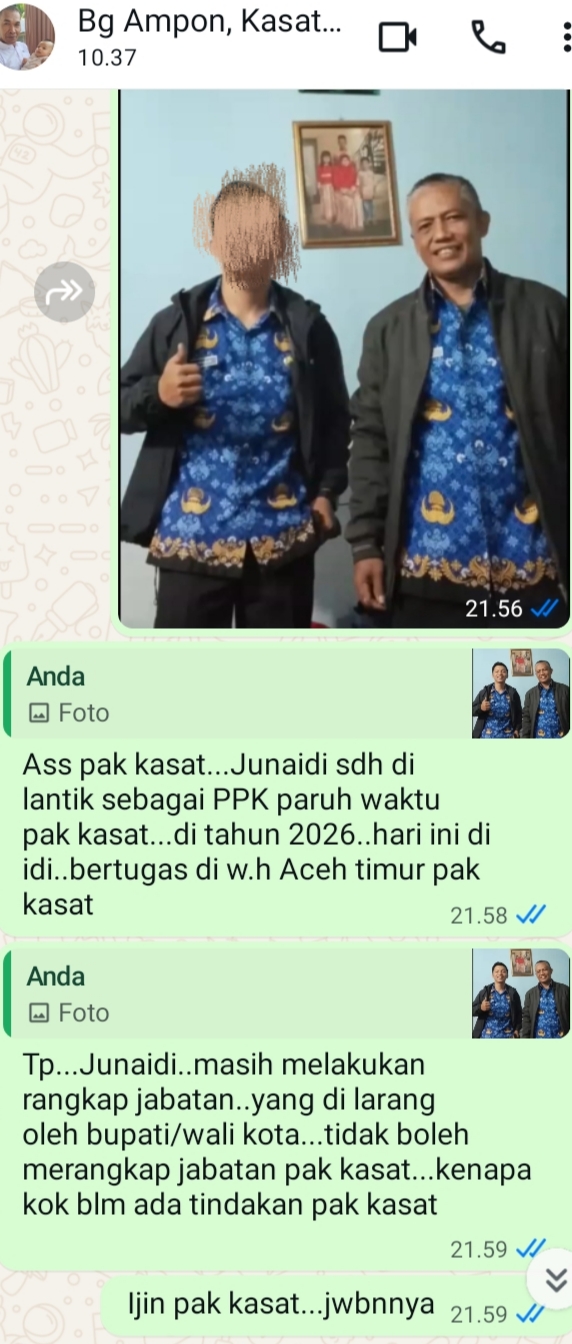 Anehnya lagi, ketika wartawan media ini juga. Sempat pernah melakukan jafrian konfirmasi, melalui chat whatsapp selularnya. Yang disebut-sebut sapaan panggilan bang “ampon”, di nomor selularnya itu. 082294xxxx31, tentang yang di sebut-sebut sapaan panggilan “junaidi”. Sdh di lantik sebagai PPK paruh waktu pak kasat…di tahun 2026..hari ini di idi..bertugas di w.h Aceh timur pak kasat, Tp…Junaidi..masih melakukan rangkap jabatan..yang di larang oleh bupati/wali kota…tidak boleh merangkap jabatan pak kasat…kenapa kok blm ada tindakan pak kasat, Ijin pak kasat…jwbnnya”, sebut nya wartawan media online ini. Yang telah di sampaikan kepada pejabat utama di sat pol pp dan w.h aceh timur itu, terkirim kepadanya jumat 23/01/2026 sekitar pukul.21.59.wib.