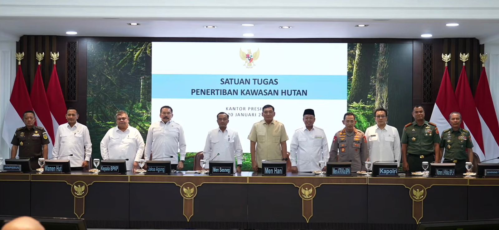 Konferensi pers tersebut dipimpin oleh Menteri Sekretaris Negara, Prasetyo Hadi. Turut hadir, Menteri Pertahanan, Sjafrie Sjamsoeddin; Kepala Kepolisian Negara Republik Indonesia, Listyo Sigit Prabowo; Jaksa Agung, ST Burhanuddin; Wakil Panglima TNI, Tandyo Budi Revita; Kepala BPKP, Muhammad Yusuf Ateh; Wakil Menteri Kehutanan, Rohmat Marzuki; Wakil Menteri Lingkungan Hidup, Diaz Faisal Malik Hendropriyono; Jaksa Agung Muda Tindak Pidana Khusus Kejaksaan Agung, Agung Febrie Adriansyah; serta Kepala Staf Umum TNI, Richard Taruli Horja Tampubolon.