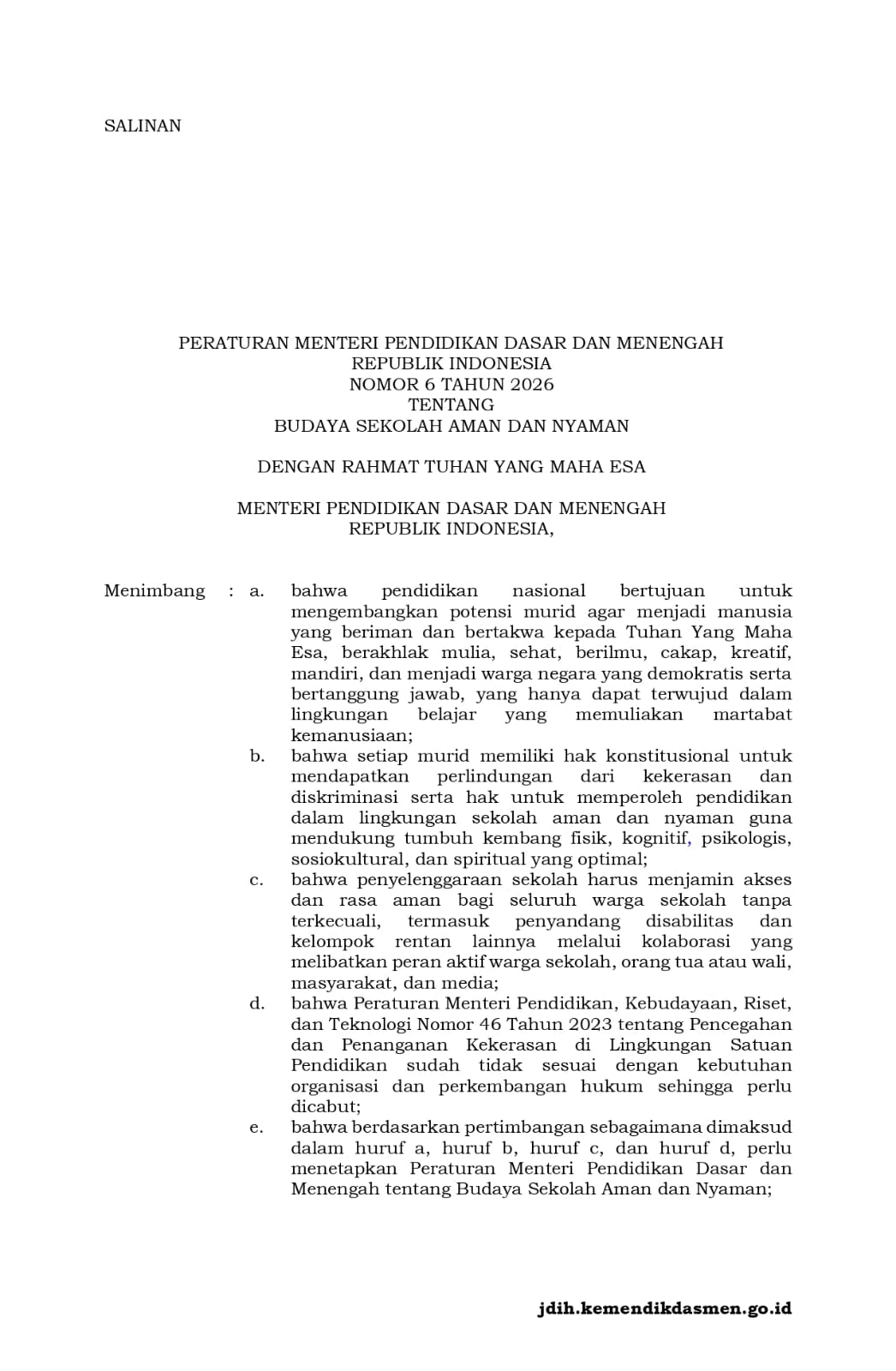 Permendikdasmen No.6 Tahun 2026, Tentang Budaya Sekolah Aman Dan Nyaman.