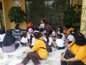 Puluhan siswa-siswi TK Regina Caeli tampak antusias mengikuti kegiatan “Polisi Sahabat Anak” yang dipimpin oleh Kanit Binmas Polsek Kembangan, Iptu I Wayan Sumberjaya, S.H.