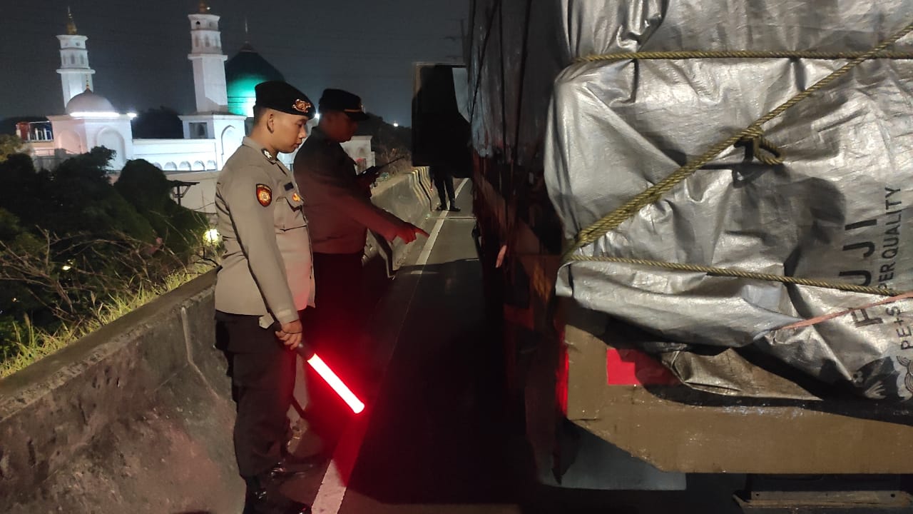 Dengan sigap, petugas membantu pengemudi truk dan melakukan pengaturan lalu lintas agar arus kendaraan tetap berjalan aman dan lancar.