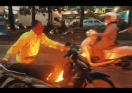 Heroik! Anggota Satlantas Cengkareng Selamatkan Motor Terbakar di Tengah Banjir