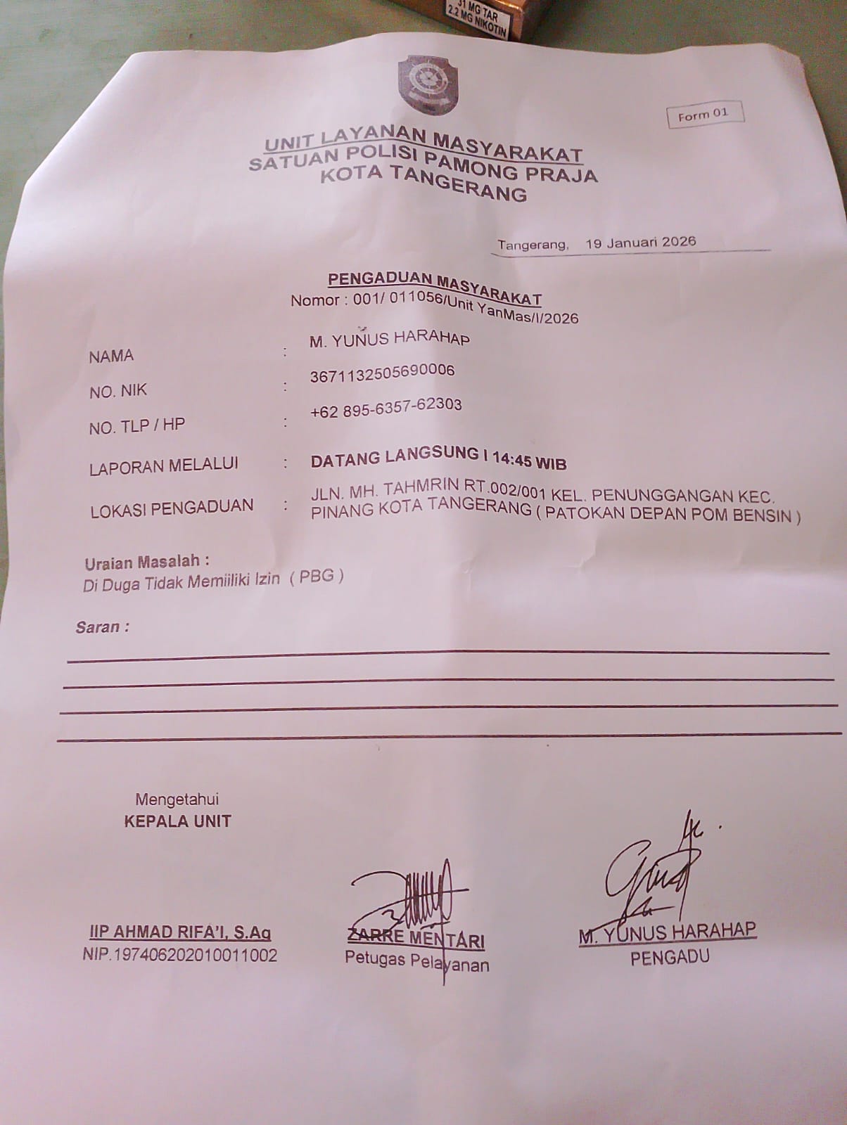 Laporan disampaikan langsung oleh warga kepada Unit Layanan Masyarakat Satpol PP Kota Tangerang pada Senin, 19 Januari 2026. Dalam laporan tersebut, warga menyebutkan bahwa pembangunan telah berlangsung cukup lama, namun tidak ditemukan papan informasi proyek maupun dokumen perizinan yang terpasang di lokasi bangunan.